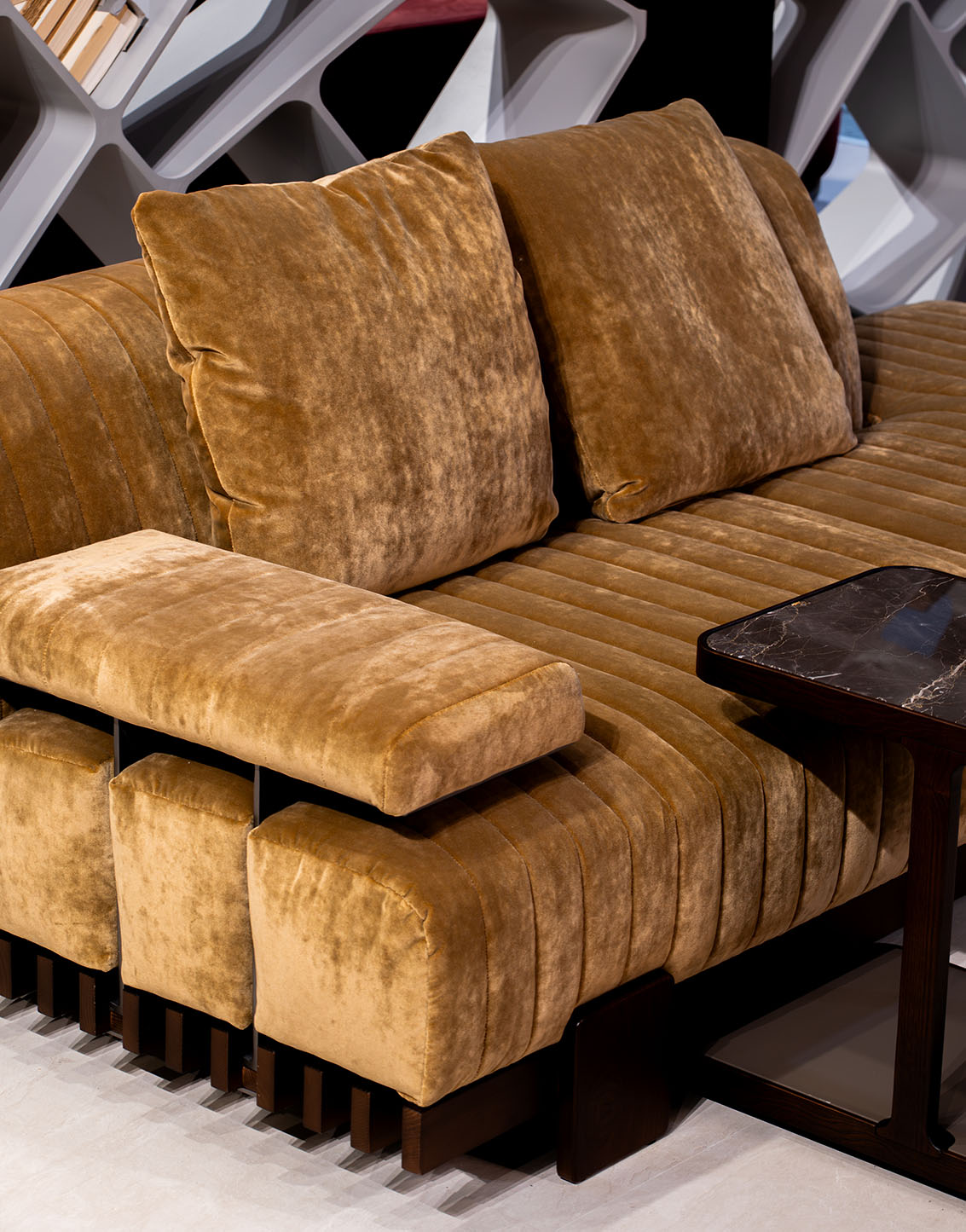 More than a simple upholstered piece, AUTORE is a modular system that introduces a new grammar of movement within living spaces. A soft, transformative platform capable of naturally reconfiguring itself and becoming, when needed, an alcove: a sheltered, intimate, and multifunctional space.