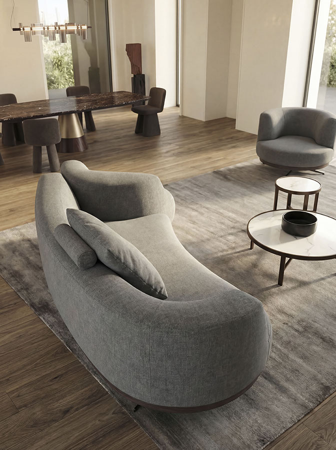 The movement that defines Bordone is not merely a functional element, but an integral part of its design language: a contemporary response to new ways of living. The sofa thus becomes a central element of the living space, in constant dialogue with the dining area or TV zone. A simple gesture—the rotation of the end modules—is enough to change perspective and redefine the domestic landscape.