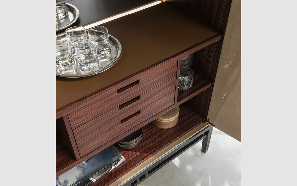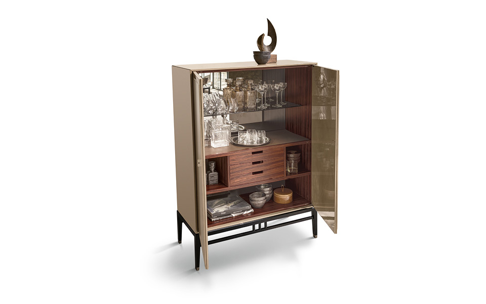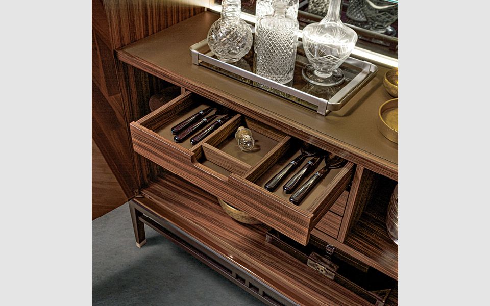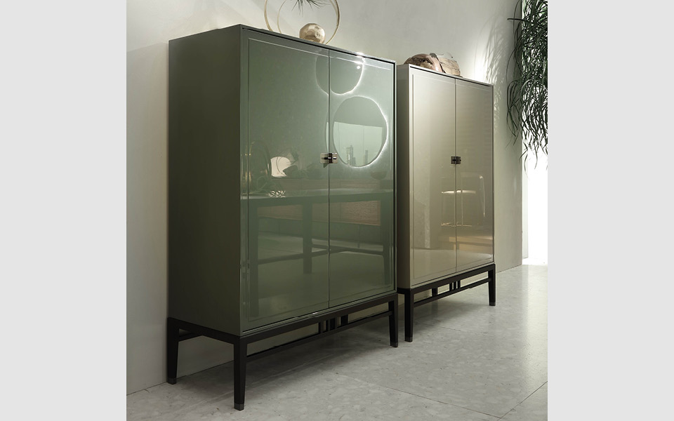 of social meeting and sharing. The rediscovery of the decorative arts from the East gives the furniture an original bright and shiny lacquered effect. The reflections of the surfaces and the metallic gleams of the handle are the assets of a collection that explores the material to bring its hidden refinement to light.