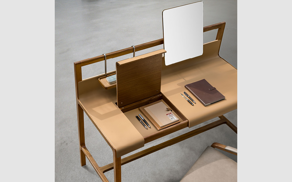 The writing surface and leather-clad details express timeless sartorial care